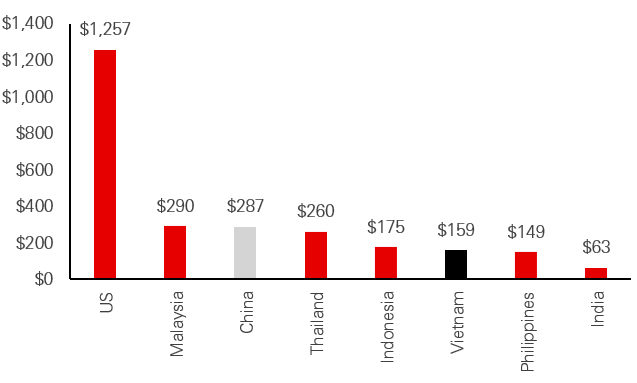 Currently, Vietnam’s inexpensive labour force does not boast high labour productivity. While manufacturing and trade has grown exponentially, local value-add remains low. Government investment in upskilling the workforce can be seen via steadily improving labour productivity. However, in the context of its Asian neighbours, more progress will be needed to capture greater value locally that supports opportunities for a more skilled workforce and insulates the country from competing supply chain locations.