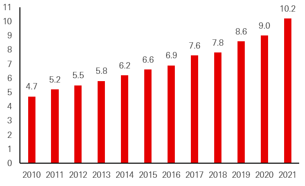 In 1995, Vietnam began integrating into the global economy by joining the Association of Southeast Asian Nations (ASEAN). This facilitated greater regional trade, investments, and economic cooperation. Since Vietnam joined the ASEAN Free Trade Area (AFTA) in 1996, its trade with other countries in the bloc has expanded more than tenfold. Growth has accelerated the most since the 2010s. From 2010-2021, exports from Vietnam to ASEAN more than tripled to USD 29.1bn. Imports to Vietnam also had a similar rise, from USD 14.5bn to over USD 41bn. In 2022 alone, import and export value to ASEAN countries grew by more than 15 per cent from the prior year.3