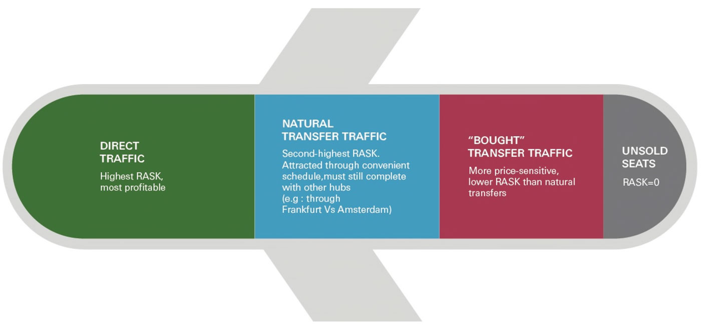 Direct traffic is more profitable than transfer traffic; higher RASK, and lower operating