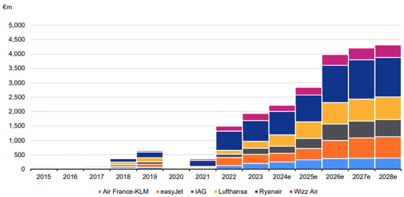 This means that, from 2026, all CO2 emissions for intra-Europe flights are ‘paid for’ at market prices. The market price of these emissions has risen nearly fivefold since 2019, which means that the total compliance cost for the largest European airlines will likely rise from less than EUR500m in 2019, to above EUR4bn from 2026; taking the total fuel bill some 30 per cent higher compared to 2019, in spite of the price of oil being moderately lower today than it was five years ago.