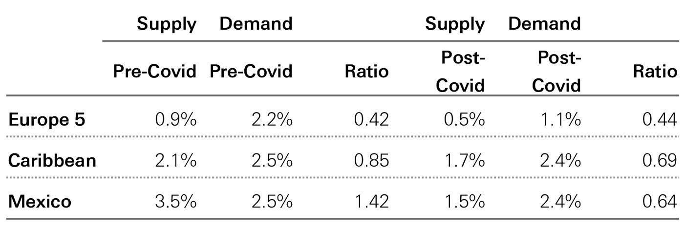 In the five years to 2020, hotel room growth was in the region of 2-3 per cent p.a. across key vacation markets; whereas since 2020, this figure has broadly halved.