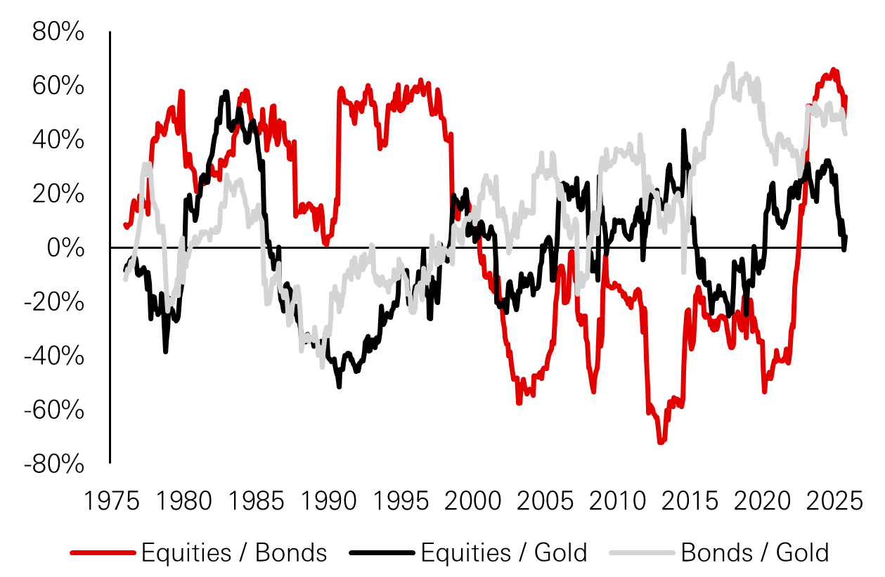 • Gold’s role in portfolios is shifting from a tactical hedge against inflation or falling real yields to a structural reserve asset, as its price has risen sharply even in an environment of high real rates and subdued inflation