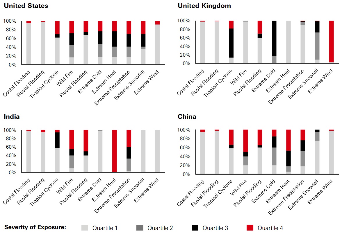 Source: HSBC AM, April 2025. Data: Granular dataset from MSCI detailing the exposure of individual companies to acute and chronic perils, categorised by severity in quartiles. Exposures are represented as a percentage of each company's assets within a specific country, peril, and quartile. For illustrative purposes only. Any views expressed were held at the time of preparation and are subject to change without notice.
