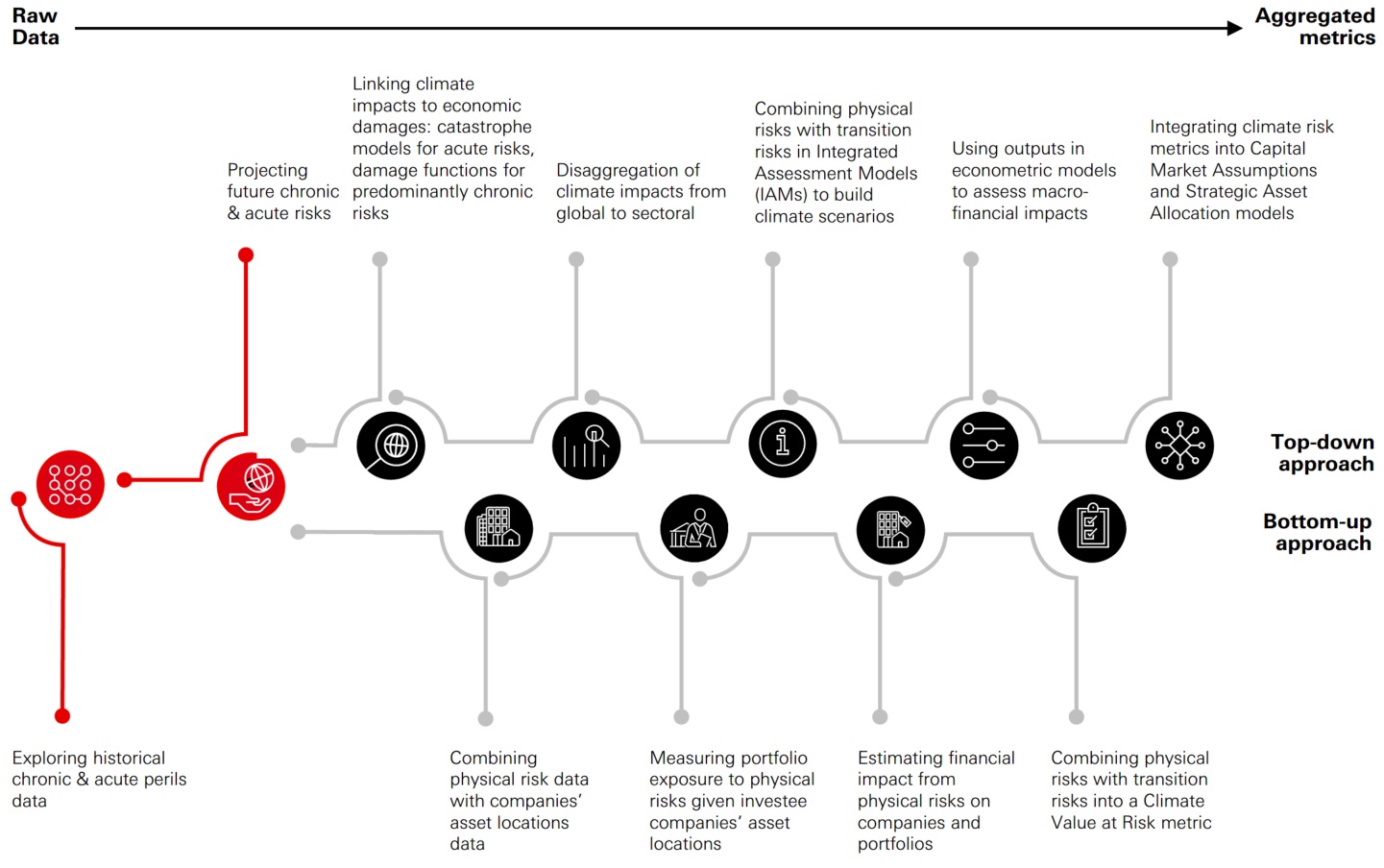 Physical risks in climate scenario analysis can be approached from both top-down and bottom-up perspectives, depending on the investment use case.